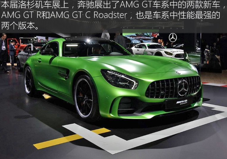 洛杉矶车展上,奔驰公司梅赛德斯-AMGGT车系中的两款新车型,——梅赛德斯-AMGGTR和梅赛德斯-AMGGTCRoadster正式展出。